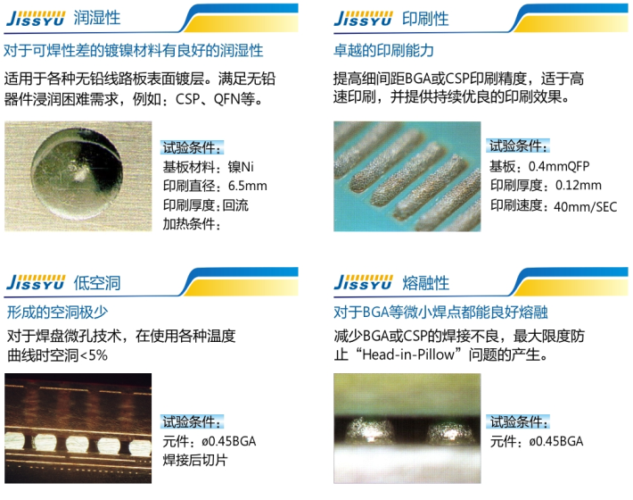 適應超細工藝印刷和回流,擁有寬工藝窗口,為01005元器件提供表面貼裝工藝解決方案。在8小時的使用中均可提供卓越的印刷性能。出色的回流工藝窗口,使得其即使使用高浸潤曲線,對Cu OSP板仍可得到良好的焊接效果。對各種尺寸的印刷點均有良好的結(jié)合。優(yōu)秀的抗坍塌性能很好抑制不規(guī)則錫珠的產(chǎn)生。焊點外觀優(yōu)秀,易于目檢??斩葱阅苓_到IPC CLASS Ⅲ級水平及IPC焊劑分類為ROL0級,確保產(chǎn)品環(huán)保和可靠性。可最大限度地滿足智能手機、平板電腦等產(chǎn)品對印刷性、可靠性、工藝效率等方面的高要求。
